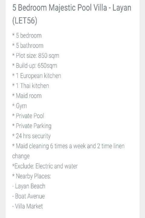 Experience luxury and comfort in this beautifully furnished 5-bedroom villa available for rent in the sought-after area of Cherng Talay. Perfect for families or groups, this single-floor villa offers a range of high-end amenities and features. Key highlights include:
