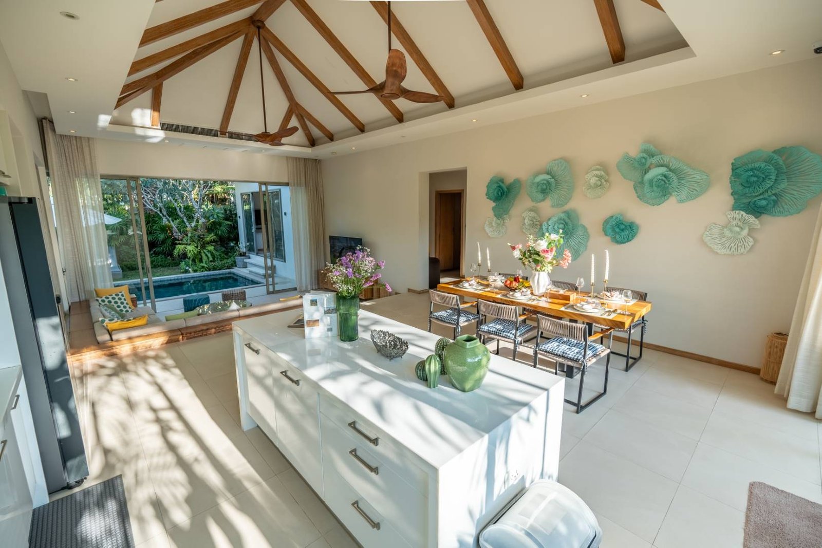 Spectacular Trichada Villa for rent, perfectly placed in the tranquil region of Cherng Talay in Phuket. This magnificent 3-bedroom, 3-bathroom property boasts an expansive indoor area of 220 sqm and land size of 450 sqm, complete with a private pool and state-of-the-art Western kitchen. Available from 200,000 THB per month on a one-year contract, with short-term rental options also available, this property epitomises luxury living on the island.